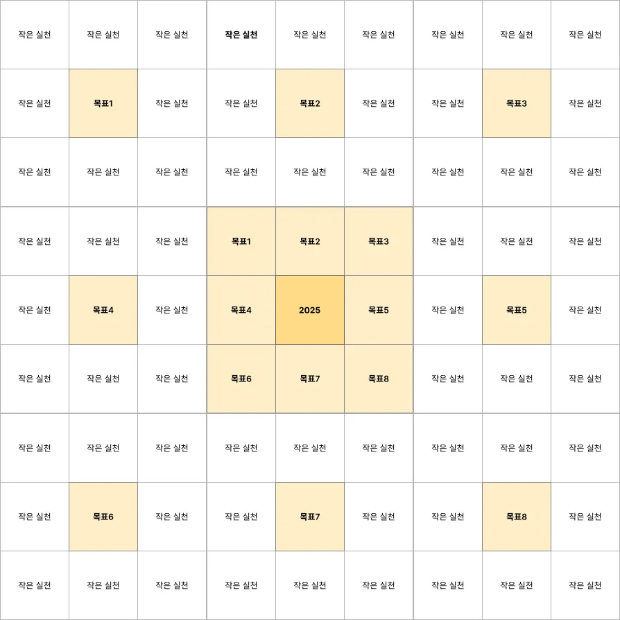 만다라트를 기반으로 내가 바라는 2025년의 나의 모습과, 그 모습을 만들기 위한 목표들, 그리고 목표를 이루기 위한 작은 실천 계획들을 작성해 보세요.