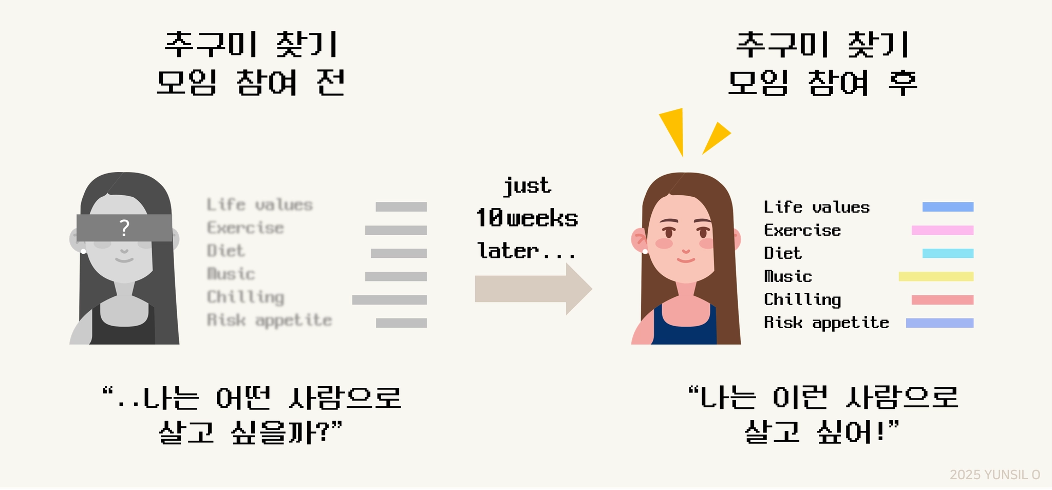 여러분의 추구미는 무엇인가요? 또는 이미 뚜렷한 추구미를 갖고 계신다면, 저를 비롯한 다른 멤버들과 함께 10주 동안 한 층 더 유연하고 단단한 내 모습을 만들어가지 않으실래요?