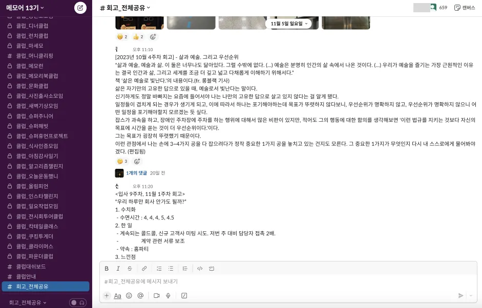 또한 메모어 활동이 이루어지는 슬랙 어플리케이션 내, 배정받은 비공개