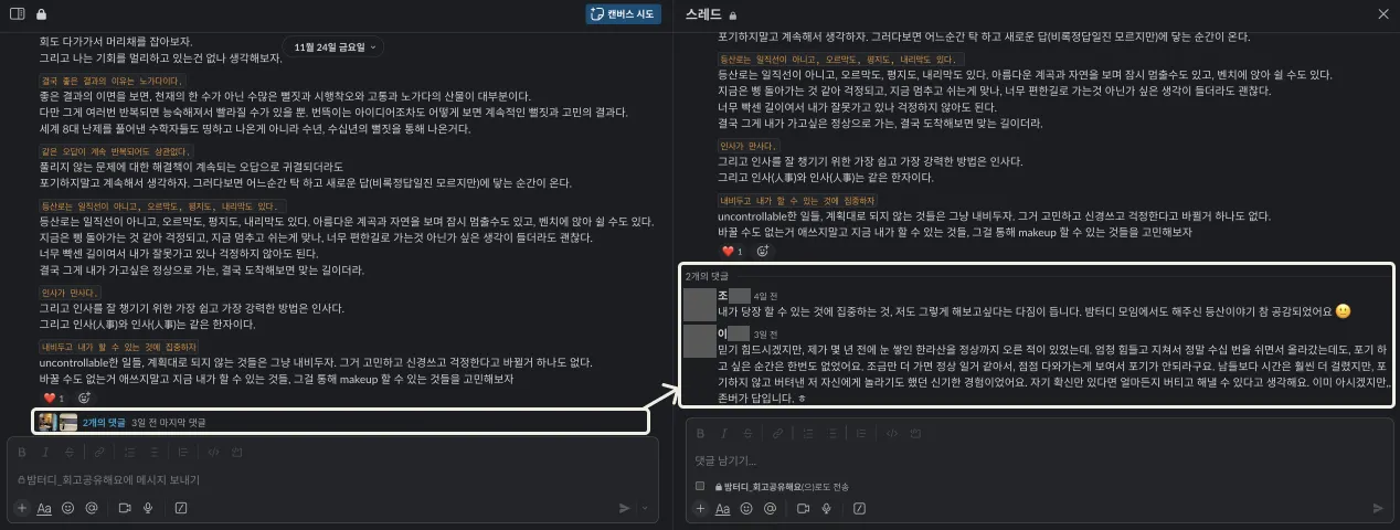 <슬랙 내 댓글 예시>