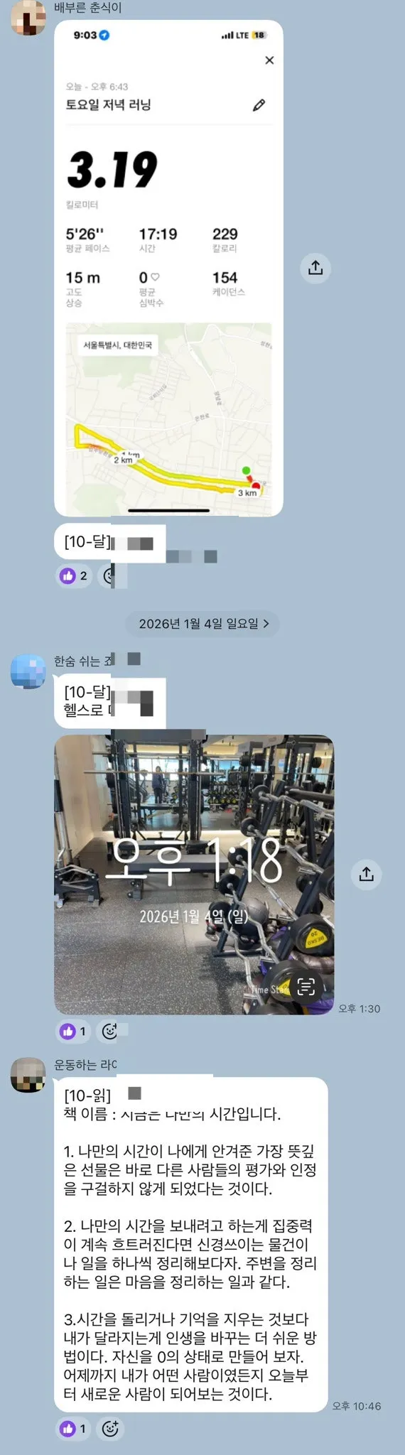 읽기 : 클럽 운영 기간 동안 책 2권 선정, 인상깊은 구절 3개 단톡방에 인증