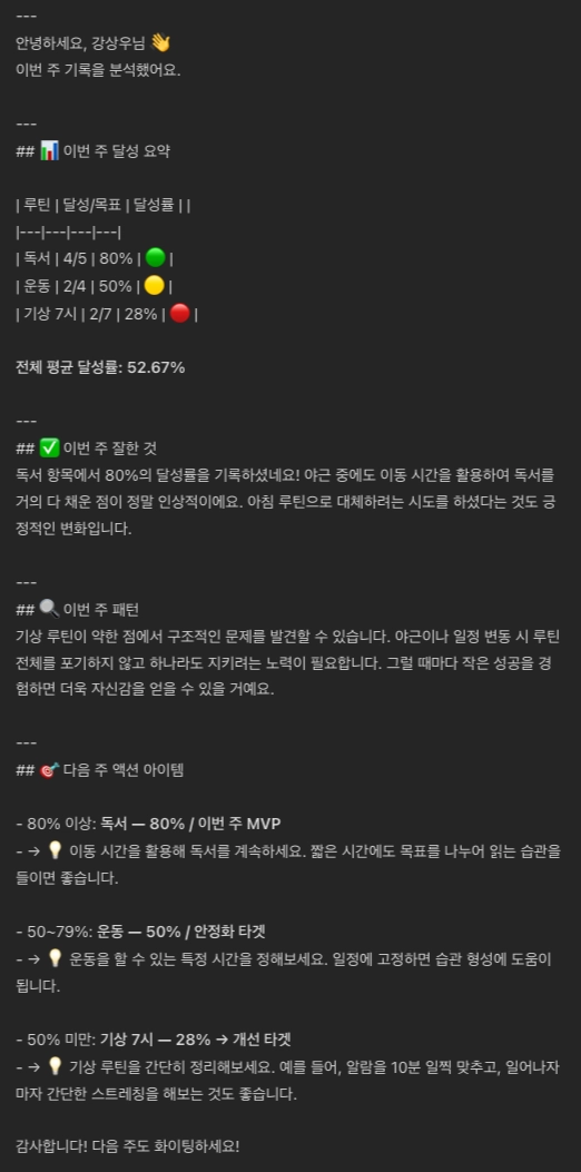 4. AI 레터 — 기록된 데이터를 바탕으로 AI와 함께 패턴을 읽고 다음 주를 조정 (매주 월요일 제공)