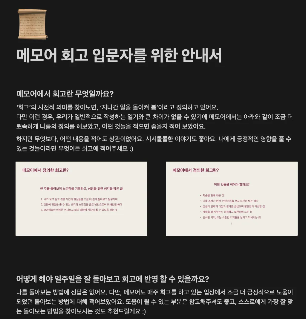 회고를 처음 접하시는 분들이 회고에 더욱 빠르게 친숙해질 수 있도록, 회고에 친숙한 분들은 한 단계 더 성장 할 수 있도록 다양한 컨텐츠를 제공드리고 있어요.