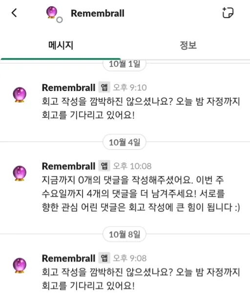 메모어는 여러분들이 회고와 댓글 작성을 놓치지 않도록, 계속해서 리마인드를 해주는 리멤브럴(Remembrall) 봇을 운영하고 있어요.
