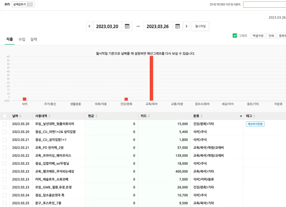 처음엔 매일 썼다가, 나중엔 일주일에 두세번 썼다가, 요새는 일요일에 회고하면서 몰아 쓴다.계좌이체나 카카오페이 자동충전 결제의 경우, 주말에 가계부를 몰아쓰다보면 그 세부 내역이 잘 떠오르지 않는 때도 있다.평소 소비가 그렇게 잦은 편은 아니라서 일주일에 한 번 정도로 충분한 것 같다.이 부분은 자신의 생활패턴에 맞게 조정해가면 될 것 같다. 중요한 것은 가계부 작성을 위한 시간/루틴을 확보하는 것!